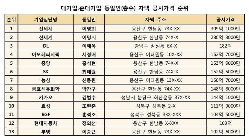비즈한국이 대기업과 준대기업의 동일인으로 지정된 재벌 총수 67인의 거주지 공시가격을 조사해 순위를 매겼다. 박삼구(금호아시아나)·김홍국(하림)·유정현(넥슨)·구교운(대방건설)·송치형(두나무)·김웅기(글로벌세아) 회장은 자택 주소지를 공개하지 않았고, 박문덕(하이트진로) 회장은 기존 주택을 허물고 새 단독주택을 짓고 있어 대상에서 제외했다.