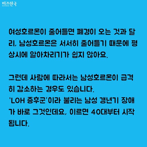 여성호르몬이 줄어들면 폐경이 오는 것과 달리, 남성호르몬은 서서히 줄어들기 때문에 평상시에 알아차리기가 쉽지 않아요.