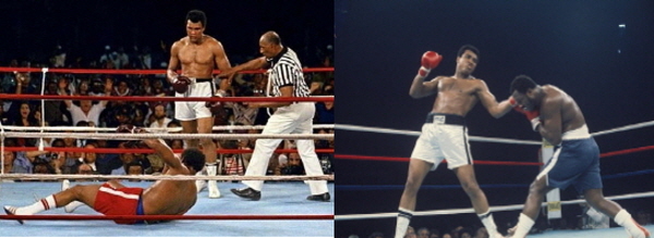 | ▲ 무하마드 알리가 조지 포먼과 1974년 시합에서 8회 KO승을 거두고 있다(왼쪽). 1975년 시합에서 조 프레이어저에게 훅을 작렬시키는 알리. 이 경기에서 알리는 14회 TKO로 이겼다. | ||