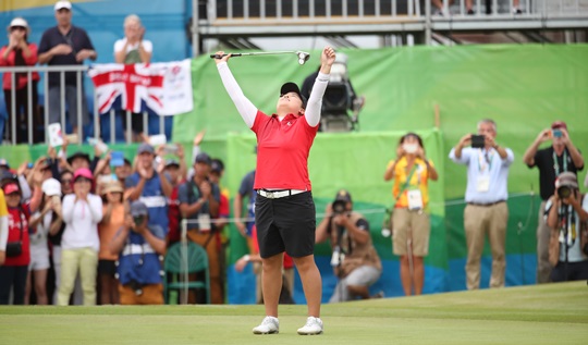 | ▲ 4라운드 18번홀에서 홀아웃을 한 후 금메달이 확정되자 박인비 선수가 두 손을 높이 들어올렸다. 사진=연합뉴스 | ||
