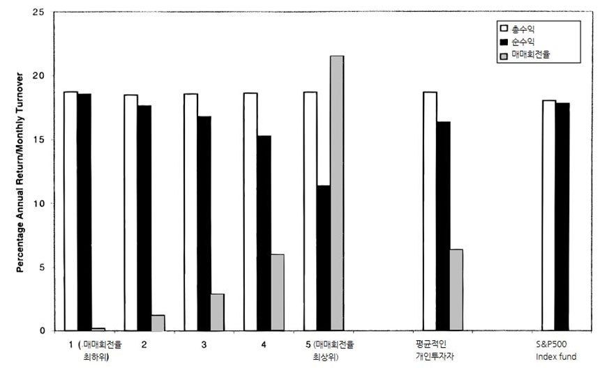 이는 비단 한국에만 해당되는 내용이 아니다. 미국의 바버와 오딘은 미국 개인투자자들을 매매회전율에 따라 5개 그룹으로 분류한 다음, 각 그룹의 수익률을 조사해봤다(2000년). 그 결과, 아래 그림처럼 흥미로운 결과를 얻을 수 있었다.**