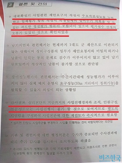 ‘비즈한국’은 국방부 감사실에서 2016년 11월 작성한 ‘대북확성기 사업관리 적정성 여부 감사 결과보고’ 문건을 입수했다. 해당 문건에는 “(심리전단이 작성한) 제안 요구서에 주요 성능 누락 및 과도한 정성 평가 부여”, “점수미달 업체를 사업자로 선정” 등, 나중에 군 검찰과 감사원 조사 결과에서 밝혀진 비리 사실이 대부분 명시돼 있다.