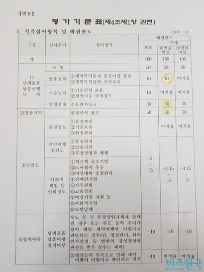 그런데 ‘비즈한국’이 입수한 훈령에 따른 적격심사 항목을 보면, ‘납품 실적’ ‘기술능력’ ‘경영상태’ 등, 장비가 실제로 존재해야만 평가가 가능한 항목들이 기재 돼 있다. ‘연구 개발 중’이라 실물이 없는 장비로는 적격 심사 자체가 불가능하다. 문제가 되는 민간업체의 장비는 연구개발 중이라서 심사 기준 대상에 조차 오르지 못하는데도 결국 사업에 낙찰됐다.