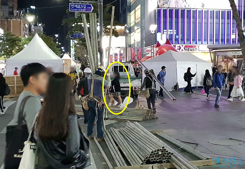 어두운 상황에서 잘 보이지도 않은 철제빔은 보도의 절반까지 튀어나와 있었다. 휴대폰을 보며 걸을 경우 얼굴에 부딪힐 수도 있는 아슬아슬한 상황이었다. 그럼에도 행인들은 익숙하다는 듯 무심하게 거리를 오갔다. 인부들 또한 철제빔을 어깨에 인 상태에서 별 생각 없이 보행자들 사이를 누볐다. 안전불감증에 빠진 대한민국의 일상적인 모습이다.