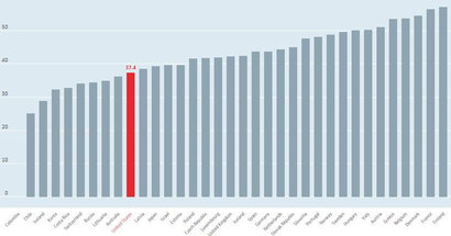 그러나 현실은 정반대다. 미국은 유럽에 비해 압도적으로 소득불평등이 심한데도 정부의 지출은 낮다. 아래의 그래프는 2017년 기준 경제개발협력기구(OECD) 가입 국가의 지니계수를 보여준다.