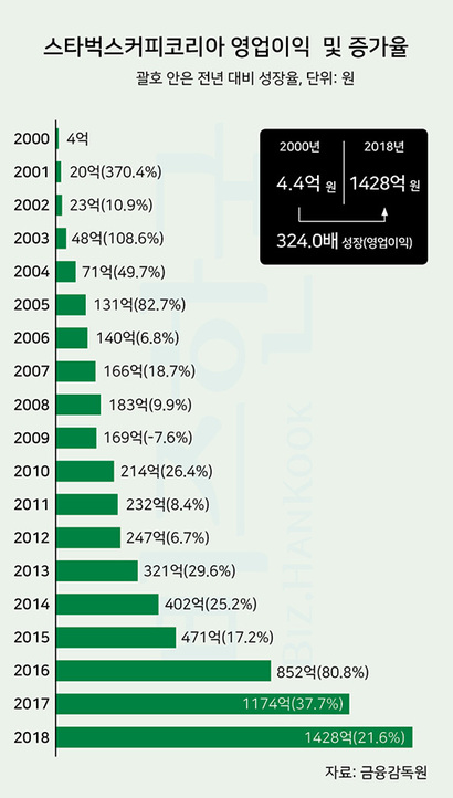 2018년 매출은 2000년 매출의 176.3배. 매년 20% 이상의 고성장이다. 2000년 이후 매출 증가율이 20% 아래로 떨어진 해는 2006년, 2010년 두 번뿐이다. 그마저도 18.4% 이하로는 내려가지지 않았다. 커피시장이 포화상태라고 여겨지는 최근에도 20% 이상의 고성장세를 유지하고 있다.