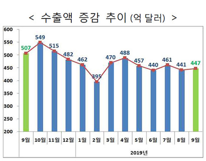 수출증가율은 2018년 10월 22.5%를 기록한 후 그해 11월 3.6%로 크게 감소한 뒤, 12월 -1.7%로 마이너스로 돌아섰다. 이후 계속 마이너스를 보이고 있다. 올해 8월 -13.8%까지 하락했지만, 9월 -11.7%로 감소세가 둔화되긴 했다.