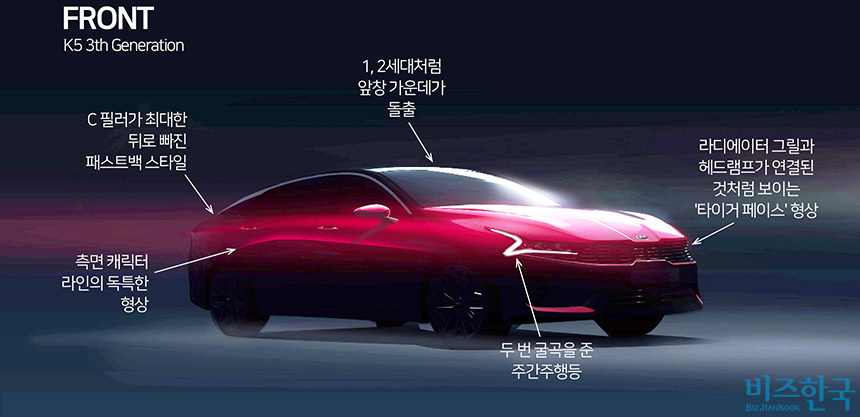 [비즈한국] 기아자동차가 12월 출시 예정인 3세대 K5(케이파이브)의 렌더링 이미지를 29일 최초로 공개했다. 실사 사진이 아닌 데다 부분적인 이미지만 공개돼 전체적인 모습을 볼 수는 없지만, 신형 K5의 디자인 콘셉트를 가늠할 수 있다.