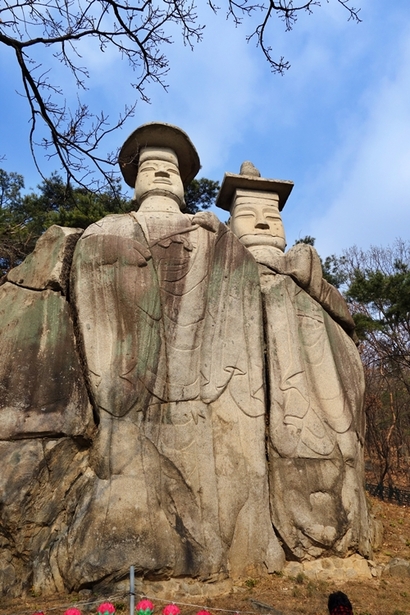 주차장에 차를 대고 숲길을 100m쯤 걸어가면 바위를 깎아 만든 거대한 불상 둘이 눈앞을 막아선다. 이들의 공식 이름은 ‘파주 용미리 마애이불입상’(보물 제93호). 파주 용미리는 지역명이고 ‘마애’는 바위에 글자나 그림을 새기는 것, ‘이불’은 부처님 두 분, ‘입상’은 서 있는 조각상을 뜻한다. 그러니까 ‘파주 용미리 바위에 부처님 두 분을 새긴 불상’이 되는 셈이다.