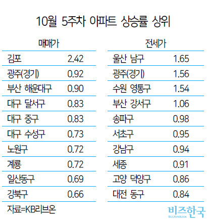 10월 5주차 KB리브온 아파트 시세 변동률을 보면 경기도 광주시의 결과가 주목할 만하다. 매매가가 0.92% 상승하여 262개 시군구 중에 2위를 하였고, 전세 상승률은 무려 1.56%나 상승했다. 광주시가 아파트 시장에서 상위 순위를 차지한 건 정말 드문 일이다.