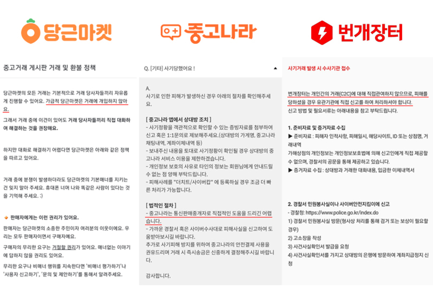 3사 모두 사기 거래에 대해 환불 관련 도움을 주진 않지만, 법적인 절차와 판매자의 서비스 이용 금지 조치를 안내한다. 업계 관계자는 “개인 간 거래에서 플랫폼이 할 수 있는 영역은 제한적이다. 하지만 사례를 데이터화해 사전에 사기 거래를 막거나 사기꾼의 재가입을 막는 시스템을 만들어가고 있다. 당근마켓처럼 대면 거래를 권장하거나 번개장터의 번개페이(거래가 완료될 때까지 플랫폼이 결제 대금을 보관)처럼 자체 페이 정책을 수립하는 등 여러 보완책이 있다”고 설명했다.