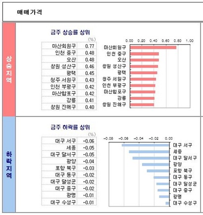 KB부동산이 발표한 주간KB주택시장동향 조사에 따르면 이달 첫째 주(6일 기준) 아파트값이 하락한 지역이 많아졌다. 대구 서구의 하락 폭이 가장 큰 가운데 달서구, 동구, 달성구, 중구, 수성구 등 대구광역시 8개 구 중 무려 6개 구가 하락했다. 이 외에도 세종시, 전남 광양시, 경북 포항 북구, 경기 광명시 등 전국 226개 시군구 중 총 10개 시군구의 아파트 평균 시세가 떨어졌다.