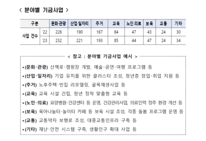 행안부가 공개한 자료에 따르면 투자계획은 문화·관광, 산업·일자리, 주거 3개 분야가 사업 건수에서 70% 이상 비중을 차지했다. 실제로 고창, 강진 등 다수 지역들이 근로자를 위한 주택 및 커뮤니티 시설 조성, 창업 시설, 귀농·귀어인을 대상으로 한 주거 시설 등을 사업계획에 포함했다. 넉넉지 않은 지방 지자체 예산으로는 대도시보다 교통, 교육 등 적재적소에 인프라 개선이 이뤄지지 않았고, 이에 따라 청년층 인구 유출이 가속화됐다는 분석이 기금 도입의 배경이 된 만큼 인프라 정비가 주요 사업 대상으로 여겨지는 것으로 보인다.