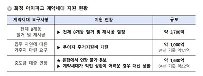 약 1000억 원 규모의 주거지원비는 공사기간 동안 계약세대의 안정적 주거를 위한 대책이다. 통상적으로 계약고객은 입주 시 잔금 30%를 마련하게 되는데, 화정 아이파크 84㎡의 경우 약 1억 7000만 원 정도가 이에 해당하는 금액이다. HDC현대산업개발은 계약고객이 공사 기간 동안 화정동 인근에서 전세(광주 서구 평균시세 약 2억 4600만 원, KB부동산) 등의 형태로 잔금에서 추가해 비슷한 크기의 집을 구할 수 있도록 1억 1000만 원을 입주 시까지 무이자로 지원할 계획이다.
