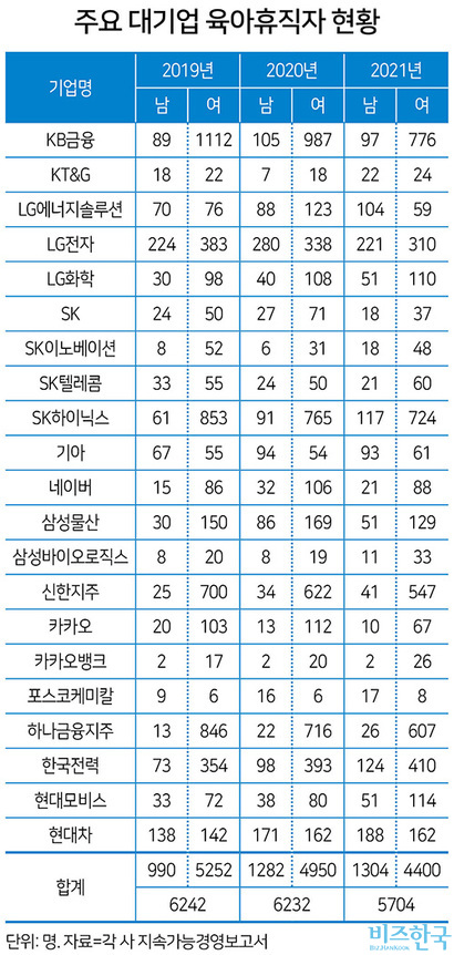 비즈한국은 시가총액(2022년 12월 14일 기준) 상위 30개 기업 중 남성 육아휴직자 수를 공개한 21개 기업의 육아휴직 현황을 조사했다. 21개 기업에서 지난해 육아휴직을 신청한 남성은 모두 1304명으로 전년(1282명)보다 소폭 늘었다. 여성 육아휴직자 수는 4400명이었다.