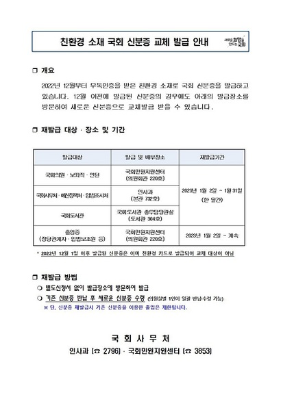 국회사무처가 신분증 교체 작업을 시작한 건 지난해 12월 28일부터다. 국회사무처는 교체 안내가 담긴 공문을 내부 전자게시판에 게시했다. 공문에는 “2022년 12월부터 무독인증을 받은 친환경 소재로 국회 신분증을 발급하고 있다”며 “이전에 발급된 신분증의 경우에도 아래의 발급장소를 방문해 새로운 신분증으로 교체 발급 받을 수 있다”고 안내했다.