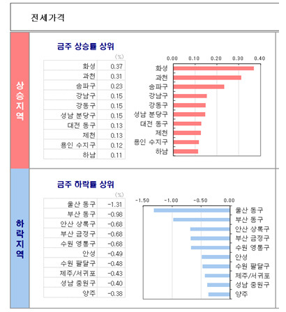 2023년 6월 19일 조사일 기준 KB 부동산 주간아파트 매매 시세 변동율을 보면 과천이 0.27% 상승한 것으로 조사됐다. 이어 송파구 0.26%, 화성시 0.19%, 강남구 0.15% 등의 순이다. 1주 동안 시세 상승률로 0.1% 이상 상승 거래되면 강보합 시장이라고 한다. 이전 거래 대비 하향 거래보다 상향 거래가 더 많다는 의미다.