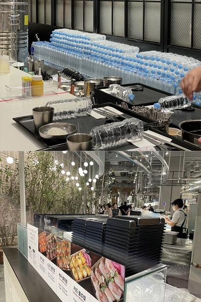 백화점 식당가에 입점한 한 식당은 매장 한편에 플라스틱 생수병을 가득 쌓아 놓고 있다. 식당가에 정수기가 있음에도 손님에게 음식과 함께 페트병에 담긴 생수를 제공한다. 또 다른 식당은 모든 음식을 일회용기에 담아 제공한다. 매장 앞에는 ‘일회용기에 담은 음식은 백화점 내 취식할 수 없다’는 안내문을 붙여놓았지만, 고객에게 실제 안내하는 사항은 다르다. 일회용기에 담은 음식을 백화점에서 먹어도 되냐고 묻자 매장 직원은 “괜찮다. 일회용기에 담은 음식도 푸드코트 내에서 먹을 수 있다”고 답했다.