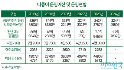 따릉이 예산은 매년 350억 원에 못 미치는 수준이다. 2019~2024년 따릉이 운영 및 확충 예산안 평균은 연 330억 가량이다. 2021년 예산은 21억 5939만 원 줄었고, 2022년과 2023년은 각각 8억 79만 원, 17억 9466만 원 늘었다. 그런데 올해 예산은 다시 17억 7837만 원 감소했다.