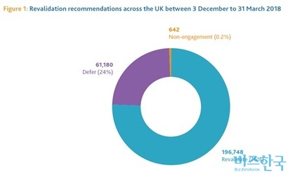 갱신 비율은 어떻게 될까? GMC는 재검증 절차를 도입하고 첫 5년간의 통계를 보고서로 작성해 공개했다. 2012년 12월 2일부터 2018년 3월 31일까지 전체 25만 8570건의 재검증 권고 대상 가운데 76%인 19만 6748건이 재검증을 통과했다. 24%인 6만 1180건이 연기를, 0.2%인 642건이 비갱신(Non-engagement)됐다. 연령별로 살펴보면 의사 나이가 70세 이상인 경우 비갱신 비율이 2.2%로 다른 연령대에 비해 높았다.