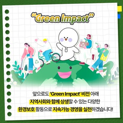 앞으로도 ‘Green Impact’ 비전 아래 지역사회와 함께 상생할 수 있는 다양한 환경보호 활동으로 지속가능 경영을 실천하겠습니다!