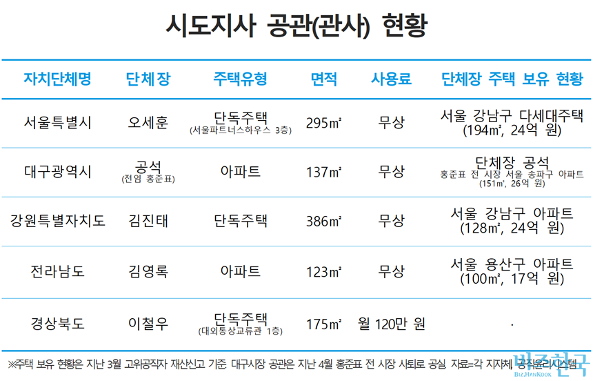 공교롭게도 단체장 관사를 무상으로 사용한 시도지사들은 서울에 자가를 보유했다. 지난 3월 공개된 고위공직자 재산 신고 내역에 따르면 오세훈 서울시장 내외는 서울 강남구에 24억 원 상당인 고급 다세대주택(194.24㎡)을 보유하고 있다. 이 주택은 현재 보증금 13억 원에 임대된 것으로 파악된다. 김진태 강원도지사 내외는 24억 원 상당 서울 강남구 선경아파트(128㎡)를, 김영록 전남도지사 내외는 17억 원 상당 서울 용산구 파크타워아파트(100㎡)를 보유하고 있다. 홍준표 전 대구시장 내외는 26억 원 상당 서울 송파구 아시아선수촌아파트(151㎡)를 소유했다. 주택 가격은 고위공직자 재산 신고가액 기준이다.