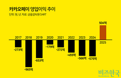카카오페이는 2017년 출범 이후 단 한 번도 연간 흑자를 내지 못한 ‘만년 적자’ 기업이었다. 출범 첫해 273억 원의 영업손실을 기록한 데 이어 2018년 965억 원, 2019년 653억 원, 2020년 179억 원의 적자를 냈다. 상장 직후인 2021년에도 272억 원의 영업손실을 이어갔고, 자회사 투자 부담 등이 더해지면서 2022년 455억 원, 2023년 566억 원, 2024년 575억 원으로 손실 규모는 오히려 확대되는 흐름을 보였다.