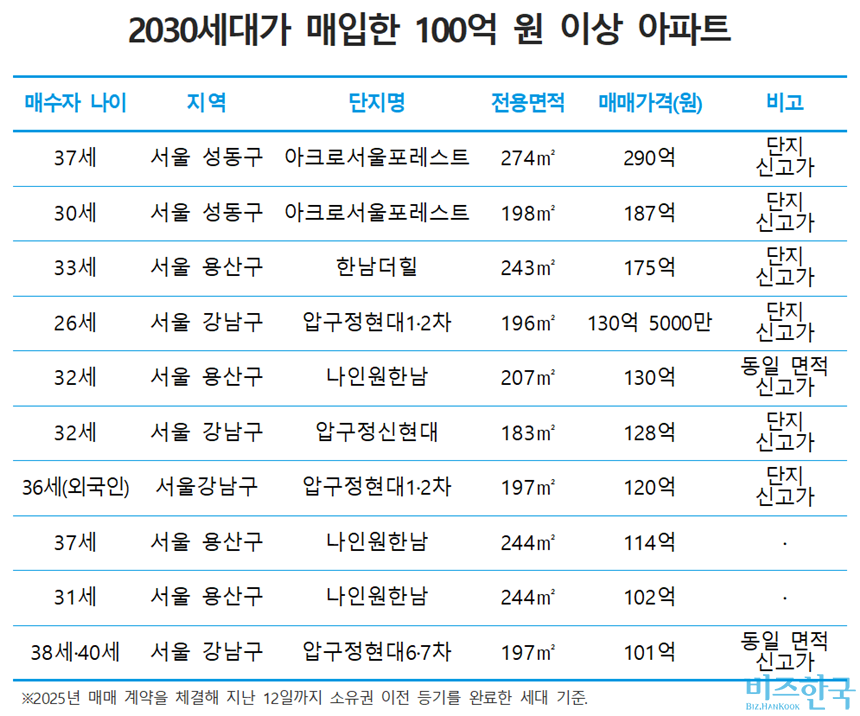 지난해 100억 원 이상에 매매된 초고가 아파트 4채 중 1채는 2030세대가 매수했다. 비즈한국이 2025년 100억 원 이상에 매매된 아파트 35채(12일 소유권 이전 완료 기준) 거래를 전수 분석한 결과, 지난해 20~30대가 매수한 100억 원 이상 아파트는 총 10채(29%)로 확인됐다. 이 가운데 6채는 해당 단지 신고가를 갈아치웠고, 2채는 단지 내 동일 평형 신고가를 경신했다.