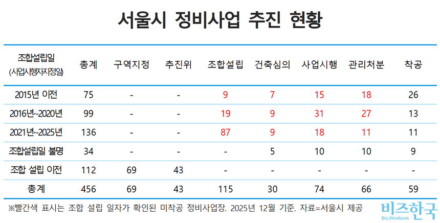 비즈한국이 지난해 말 기준 서울시 정비사업 추진현황 자료를 전수 분석한 결과에 따르면, 2015년 이전에 조합을 설립하거나 사업시행자로 지정된 서울시 정비사업장은 75곳이다. 이는 조합 설립(사업시행자 지정) 일자가 확인된 서울시 전체 정비사업장 310곳의 24%에 해당한다. 조합 설립 10년 이상인 이들 사업장 가운데 지난해까지 공사에 착수하지 못한 곳은 49곳(전체 16%), 착공한 곳은 26곳(전체 8%)으로 집계됐다.