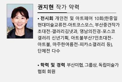 권지현 회화의 출발도 풍경이다. 그는 산책길에서 만나는 바다, 하늘, 갈매기, 들꽃, 해변의 모래 같은 자연에서 즉흥적으로 포착한 감정을 회화로 담아낸다. 그런데 작품의 구상이나 표현에 있어 풍경의 방법과 구성을 따르지만 풍경화라고 말하기는 어렵다.