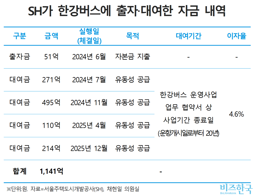 SH가 현재까지 한강버스에 투입한 자금은 1141억 원에 달한다. 2024년 6월 설립자본금으로 51억 원을 출자한 이후 2024년 7월 271억 원, 2024년 11월 495억 원, 2025년 4월 110억 원, 2025년 12월 214억 원을 대여했다. 출자 자본금을 빼면 대여금 규모만 1090억 원에 달한다. 모두 한강버스에 유동성을 공급하기 위해서였다. 한강버스는 서울시 운항결손액 보조금 지급 대상이지만, 현재까지 보조금이 지급된 사례는 확인되지 않았다.