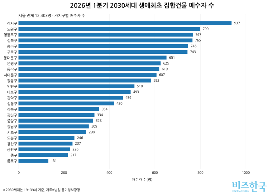 2030세대 생애 최초 집합건물 매수자가 가장 많은 곳은 강서구다. 1분기 매수자는 937명으로 전체 8%를 차지했다. 자치구별로는 △노원 799명 △영등포 767명 △성북 765명 △송파 746명 △구로 743명 △동대문 651명 △은평 625명 △동작 619명 △서대문 607명 △강동 582명 △양천 510명 △마포 493명 △관악 459명 △성동 420명 △강북 354명 △광진 334명 △중랑 328명 △강남 309명 △서초 298명 △도봉 246명 △용산 237명 △금천 226명 △중 217명 △종로 131명 순이다.